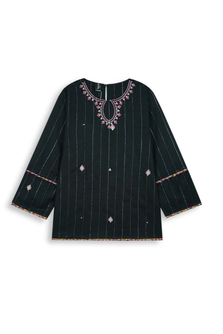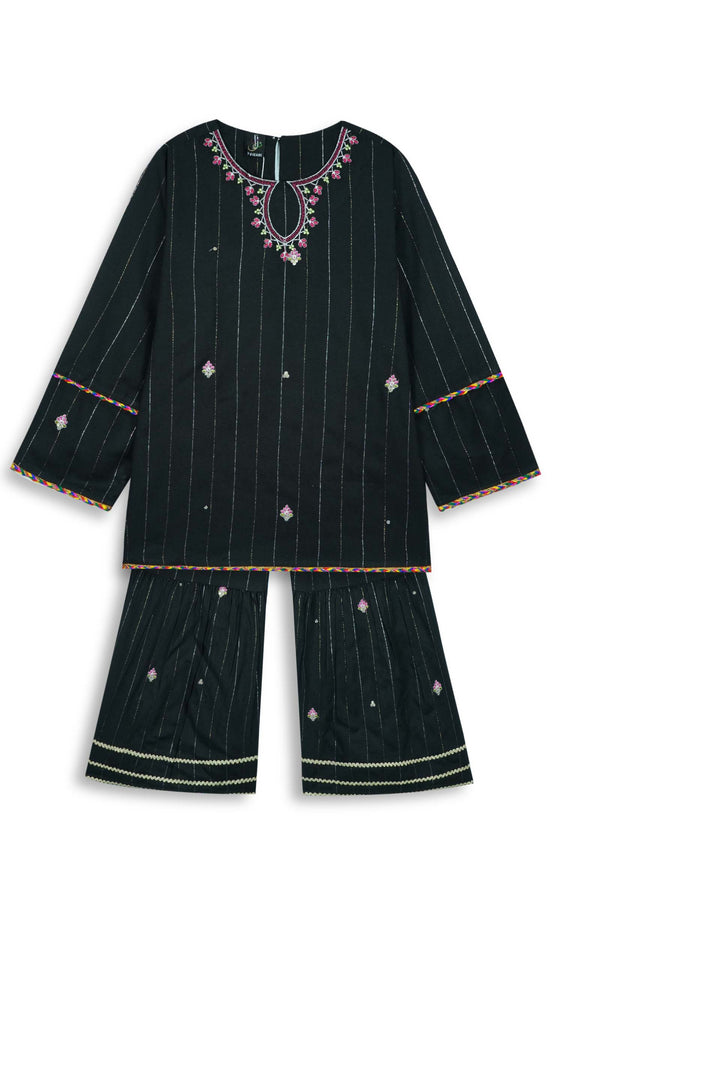 Bring traditional elegance to your little one’s wardrobe with this Black Embroidered Cotton Suit with Gharara. Crafted from soft and breathable cambric cotton, this outfit combines classic charm with modern comfort. The shirt features delicate floral embroidery around the neckline, accented with vertical silver stripes and mini embroidered motifs. The sleeves are adorned with colorful threadwork, adding a festive pop of color.