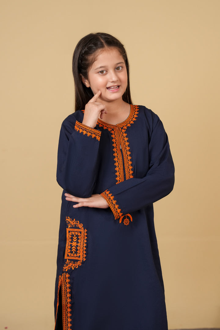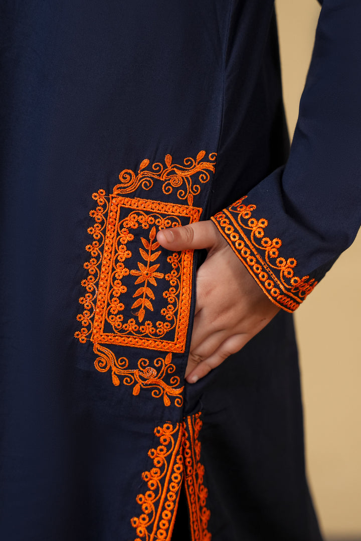 Kameez (Shirt): Navy blue with intricate orange embroidery on neckline, sleeves, pockets, and borders for a sophisticated, traditional appeal.