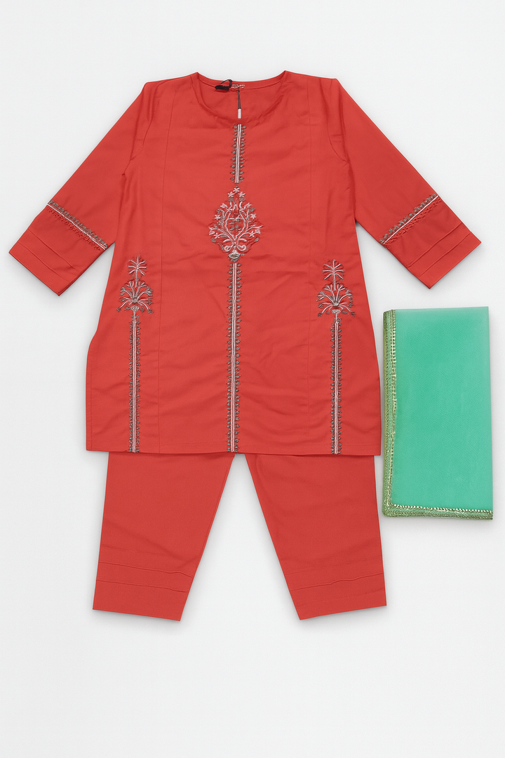 Chandni Cotton 3 Pcs Suit Multihead Embroidery with Net Dopata