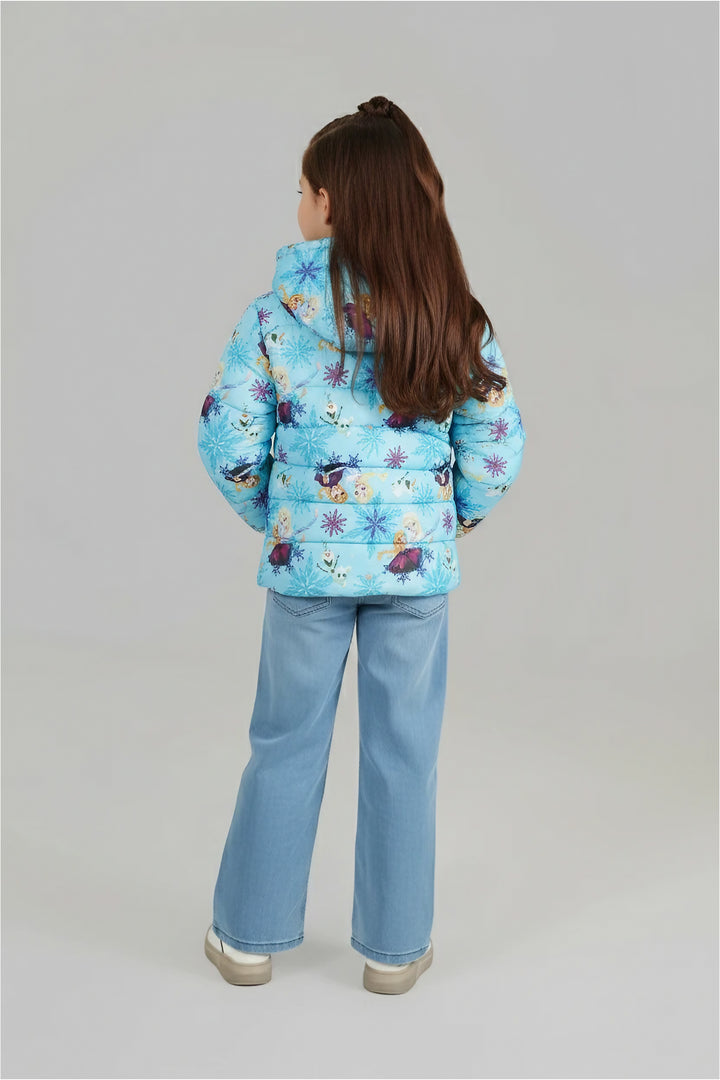 Designed for comfort and warmth, the jacket includes a full front zipper closure, padded quilting for insulation, and a protective hood to shield against cold winds. The bright Frozen-inspired design makes it a favorite pick for kids who love Disney characters, while the durable fabric ensures long-lasting wear.