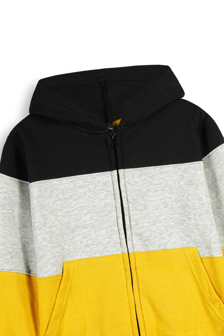 Kids Black-Grey-Yellow Color-Block Zip-Up Hoodie – 100% Cotton Fleece