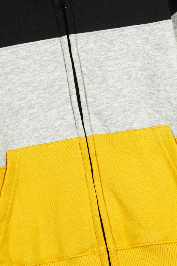 Designed in bold contrasting panels of black, grey, and mustard yellow, this hoodie offers a modern, sporty look that stands out in any setting. The full front zipper allows for easy layering, while the roomy kangaroo pockets provide both style and practicality for keeping little hands warm.