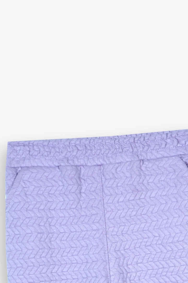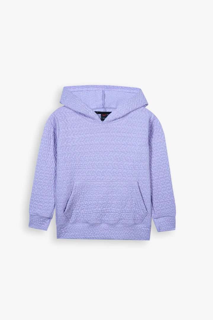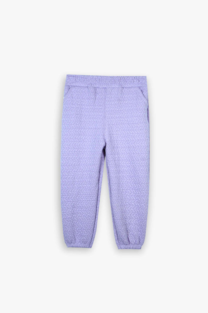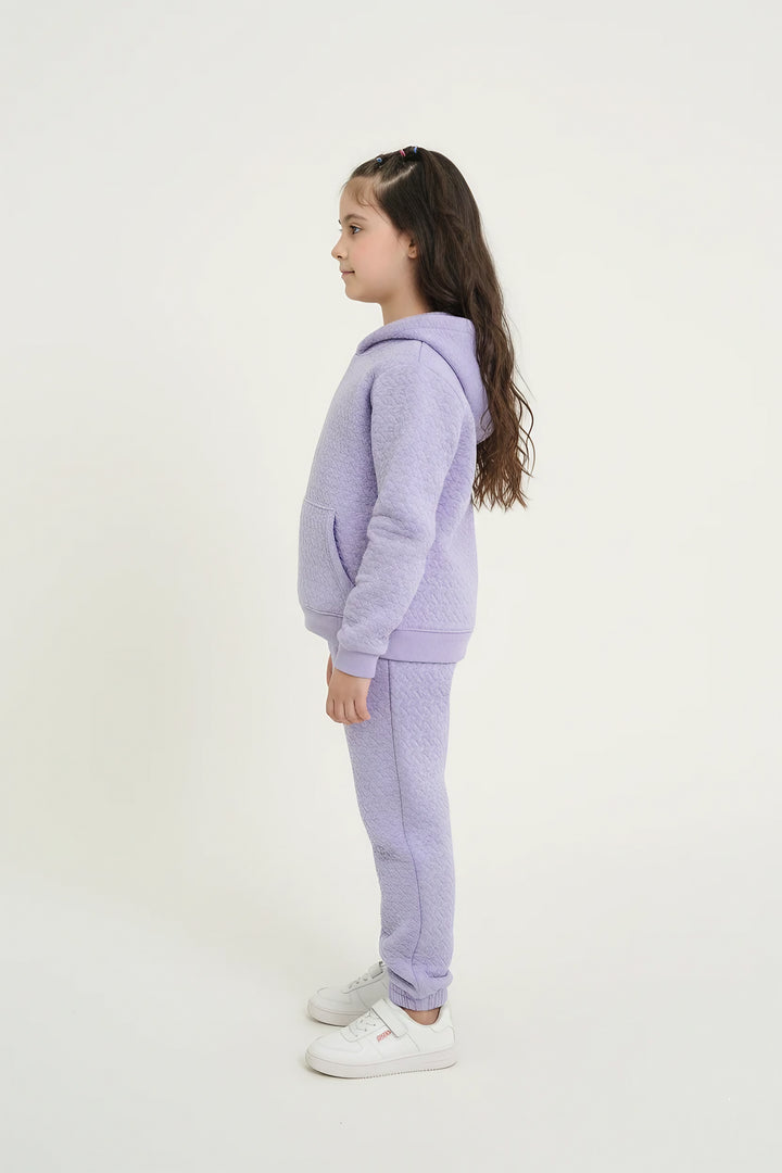 The soft lilac color adds a stylish touch, while the textured quilted pattern provides extra warmth and a fashionable look. The hoodie features a kangaroo pocket and ribbed cuffs for practicality, and the joggers come with an elastic waistband and cuffed hems for a comfortable fit.