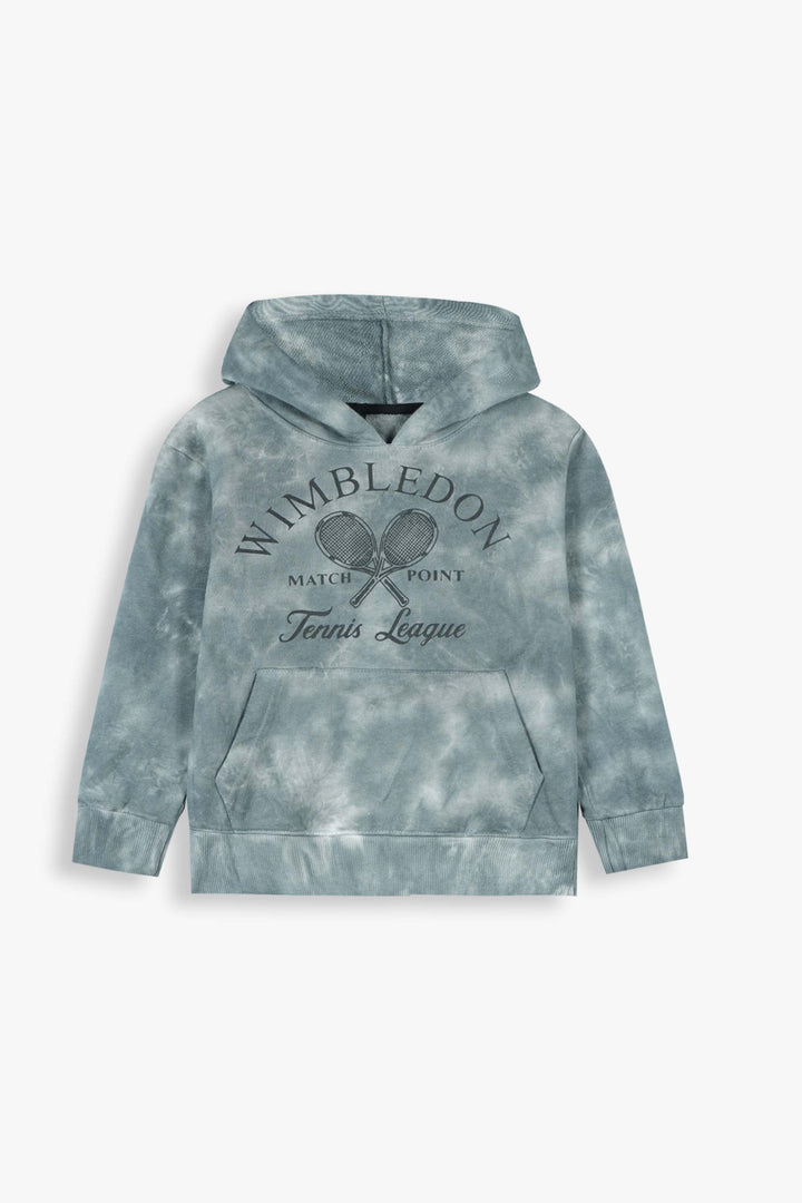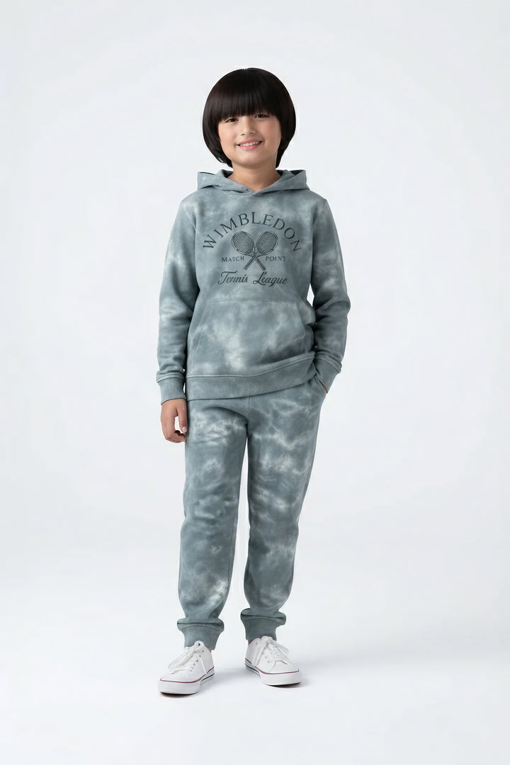 The hoodie features a trendy tie-dye effect with a bold “Wimbledon Tennis League” print, complete with a roomy kangaroo pocket and ribbed cuffs. Paired with matching jogger pants that include an elastic waistband and side pockets, this outfit combines practicality with modern streetwear style.