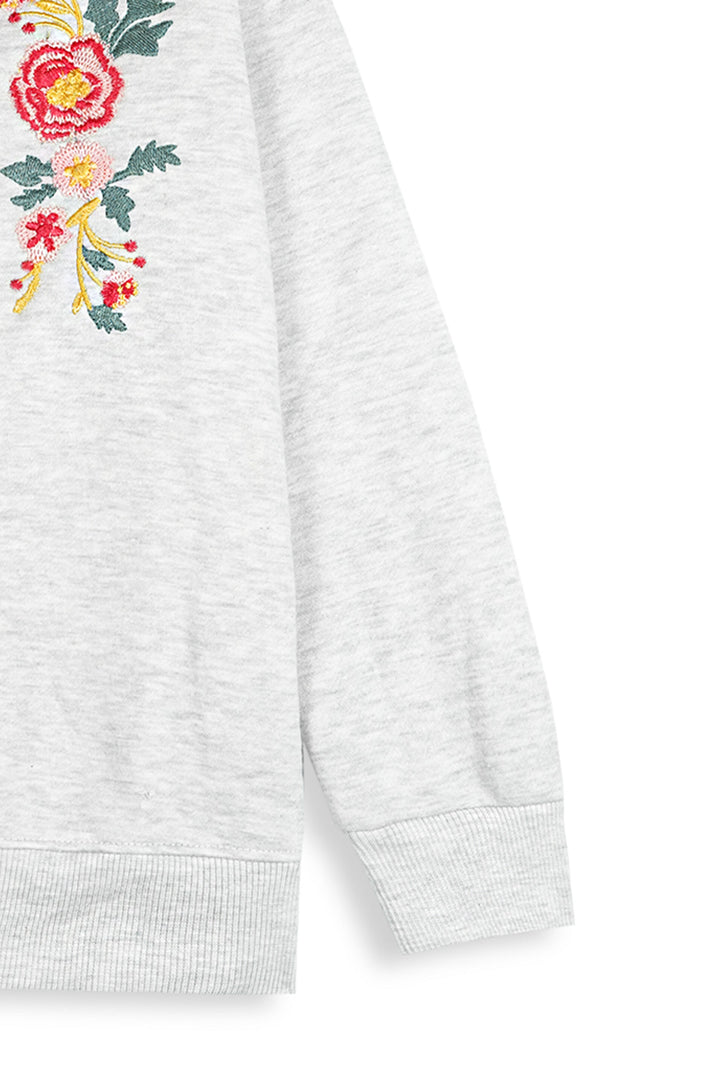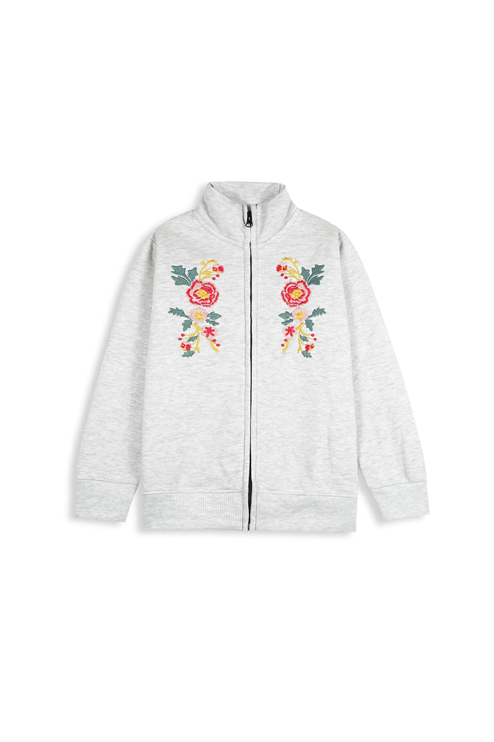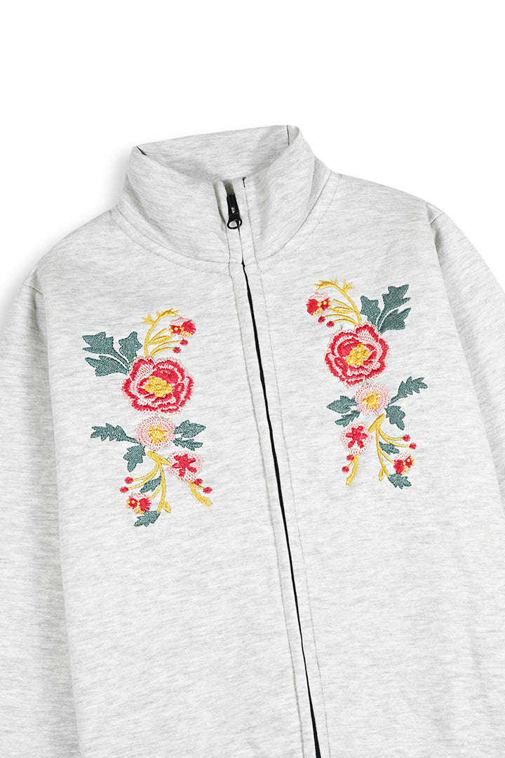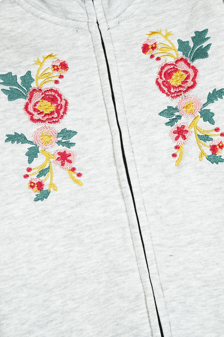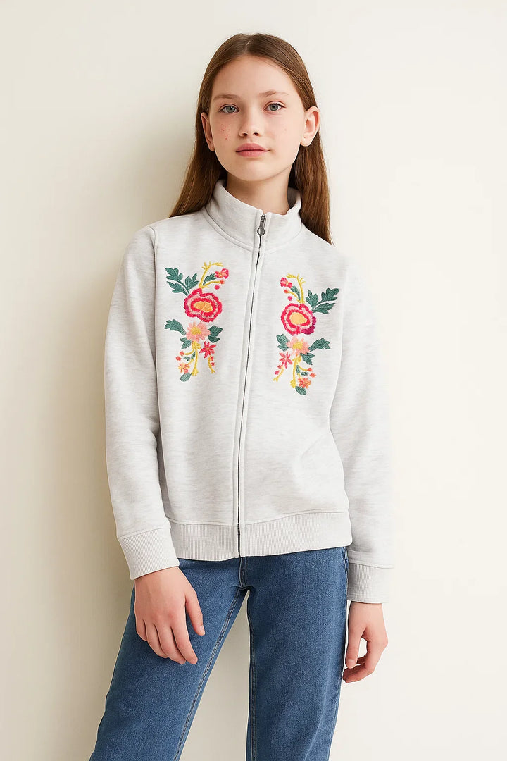 Keep your little fashionista cozy and stylish this winter with our light grey embroidered sweatshirt, crafted from premium cotton fleece. This warm yet lightweight zip-up jacket features beautiful floral embroidery on the front, adding a soft, feminine touch to a sporty silhouette.