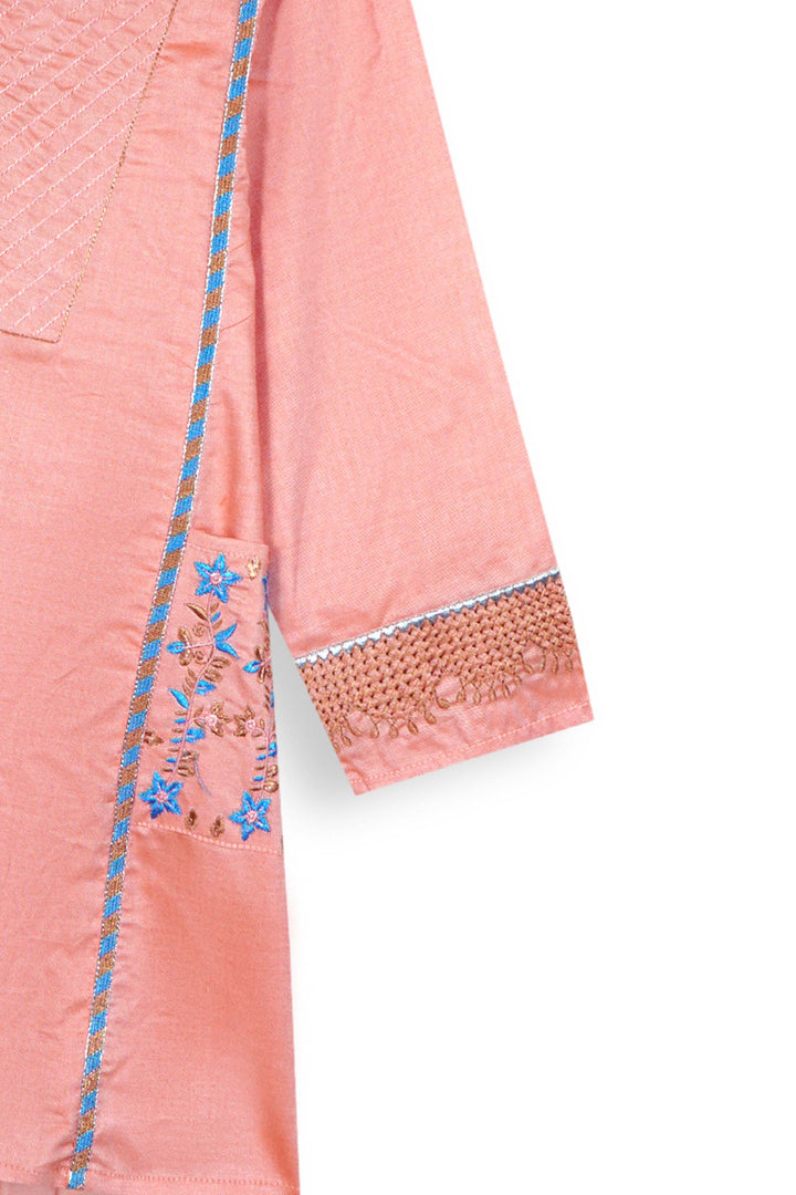 Grace your little one’s wardrobe with this Peach Embroidered 3-Piece Suit, designed for elegance and comfort. Made from soft cambric cotton, this outfit features a beautifully embroidered shirt with blue floral detailing along the side panels and sleeves. The front showcases a finely stitched geometric pattern, while functional side pockets add both charm and practicality.