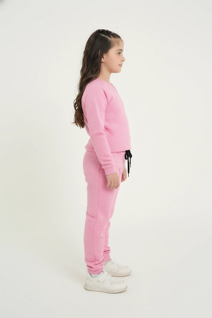 The top features a stylish neck slit for a modern touch and easy wear, while the matching jogger pants come with a drawstring waistband and elastic cuffs for a perfect fit. The textured quilted pattern gives this outfit a chic look, making it ideal for casual outings, school days, or cozy indoor wear.