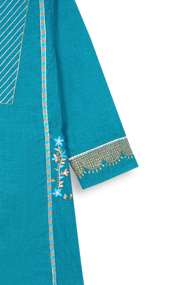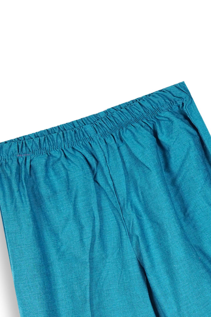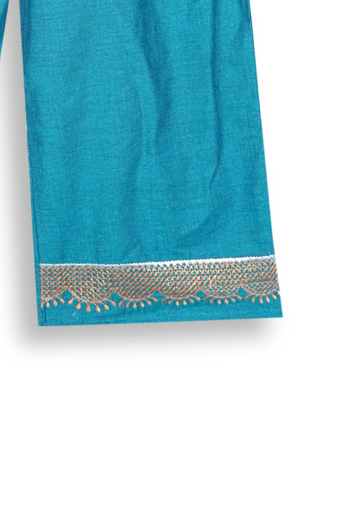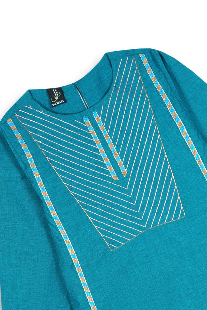 Elevate your little one’s festive look with this Teal Blue Embroidered Cotton Suit, beautifully crafted for comfort and style. Made from breathable cambric cotton, this elegant 2-piece outfit features intricate embroidery on the sleeves, front panel, and trouser hem. The gold tilla and thread detailing add a touch of traditional charm, while the modern straight-cut design keeps it chic and wearable for all occasions.
