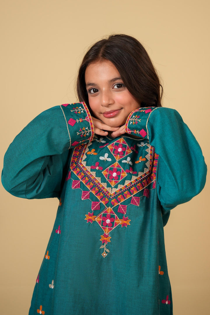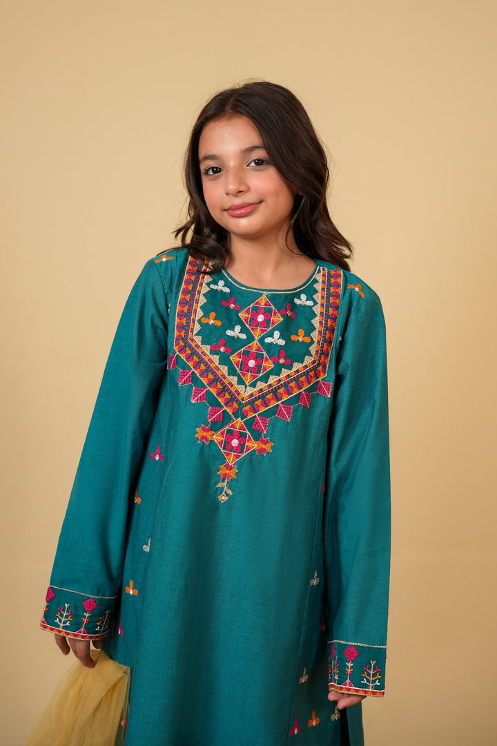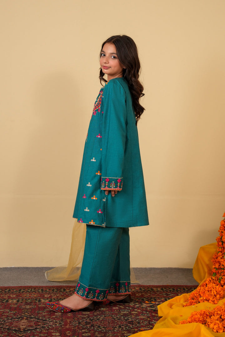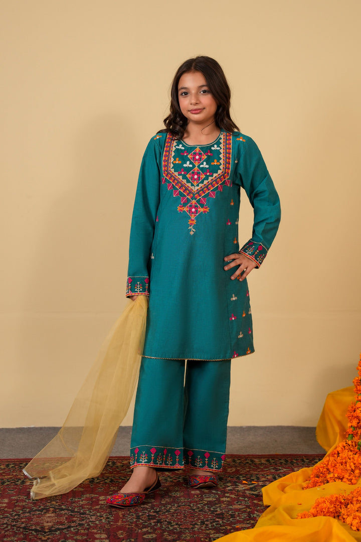 Make every celebration special with this Teal Cotton Embroidered 3-Piece Suit, crafted to bring elegance and comfort together. Made from high-quality breathable cotton, this outfit features a richly embroidered shirt with vibrant threadwork on the neckline, sleeves, and hem. The matching trouser adds a refined touch, while the soft net dupatta completes the graceful festive look.